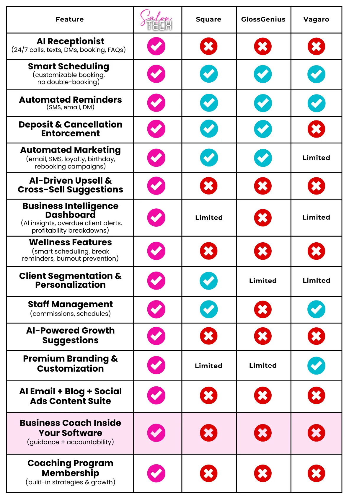 Most platforms stop at booking and payments. SalonTech goes further by adding AI-powered automation to actively grow your salon—filling your books, upselling clients, and handling marketing. It’s not just a tool, it’s your salon’s AI-powered business partner.